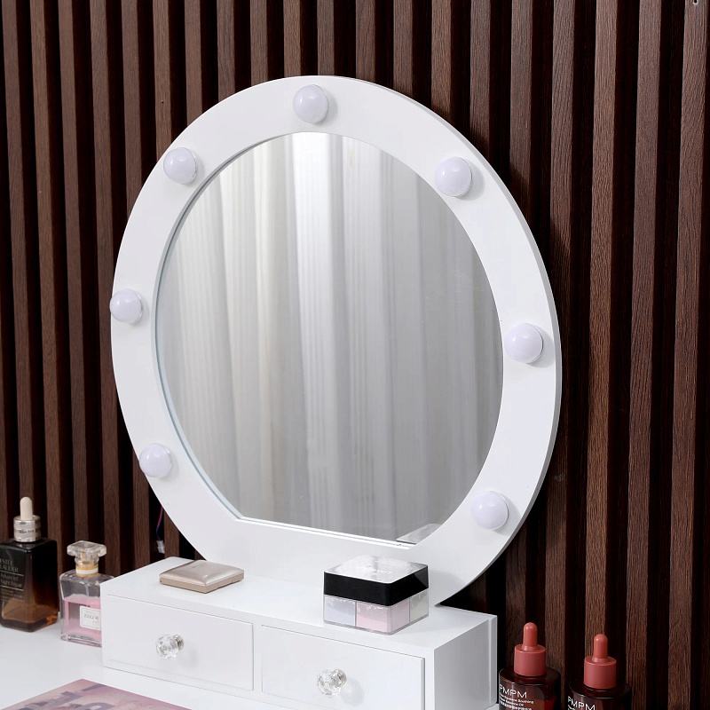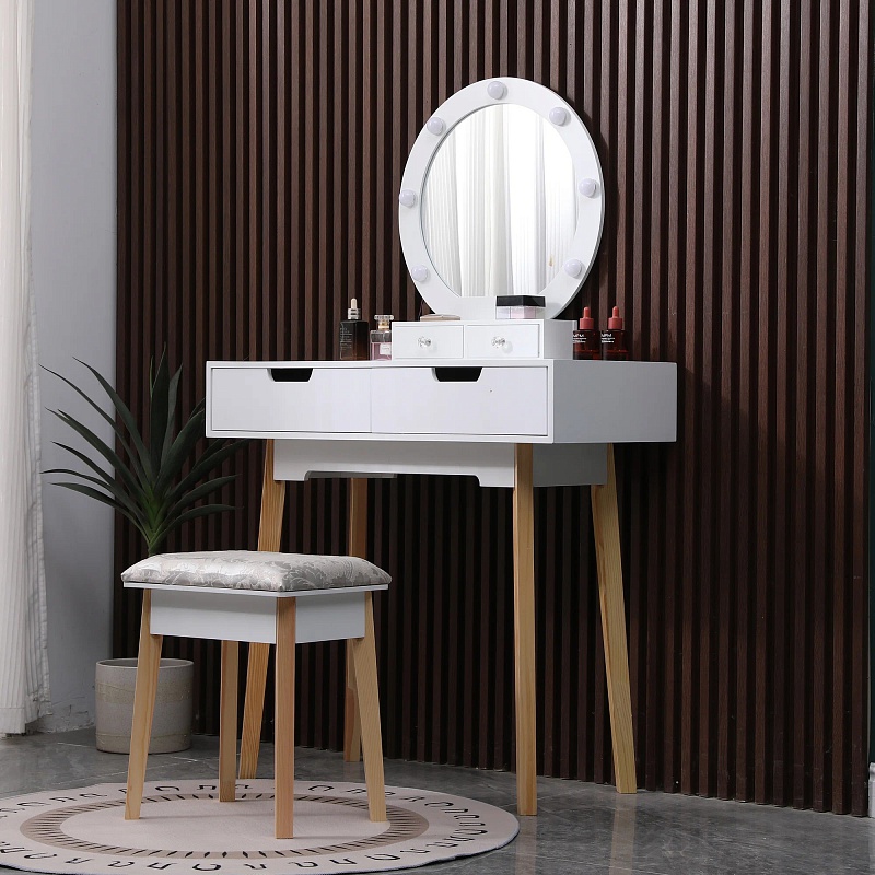 Был собран, подтеки краски внутри ящиков, мелкие сколы и царапины, состояние нормальное. Изящный туалетный столик DT-015 - новинка от Vinotti! Столик в классическом стиле с зеркалом и выдвижными ящиками порадует юную леди и ее маму. Он сочетает в себе утонченный дизайн, функциональность и удобство. За счет компактного размера столик подойдет как для спальни, так и для детской комнаты, гостиной, а также для рабочего пространства благодаря своему универсальному дизайну. Модель оборудована удобной столешницей, выдвижными ящиками для защиты ваших косметических средств и аксессуаров от пыли и прямых солнечных лучей. Лаконичный, компактный, при этом вместительный, столик DT-015 обладает практичной глубиной – 40см. Лампы по периметру зеркала равномерно освещают лицо, что делает нанесение макияжа не только удобным, но и приятным. Подсветка имеет три режима регулировки яркости (пульт проводной; лампочки в комплекте). DT-015 изготовлен из массива клёна - экологичного, прочного и легкого материала, с использованием МДФ. Покрытие - краска на основе воды и воска. Роскошный пуф на изящных ножках входит в комплект. Ткань - полиэстер, наполнитель ППУ. Размер столика: В135,5см, Ш80см, Г40см. Диаметр зеркала – 38см; диаметр с учетом рамы – 48см. Ящик выдвижной малый Г7/Ш14,5см; ящик большой Г28/Ш35см. Размер пуфа: В45см, Д37см, Ш27см.