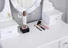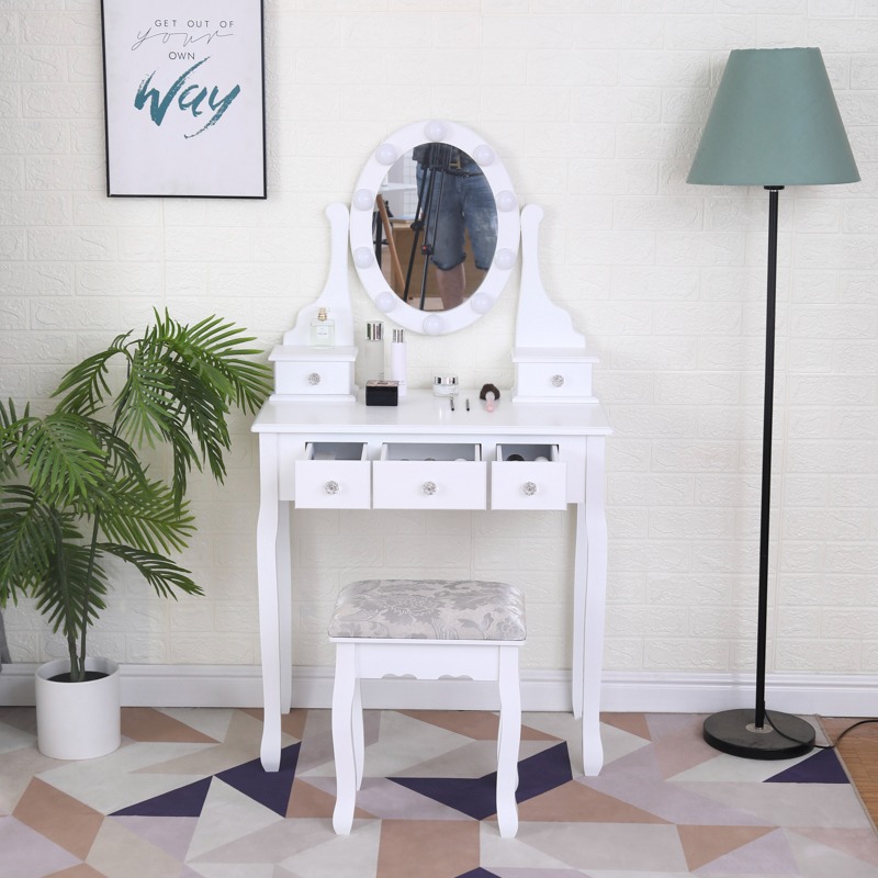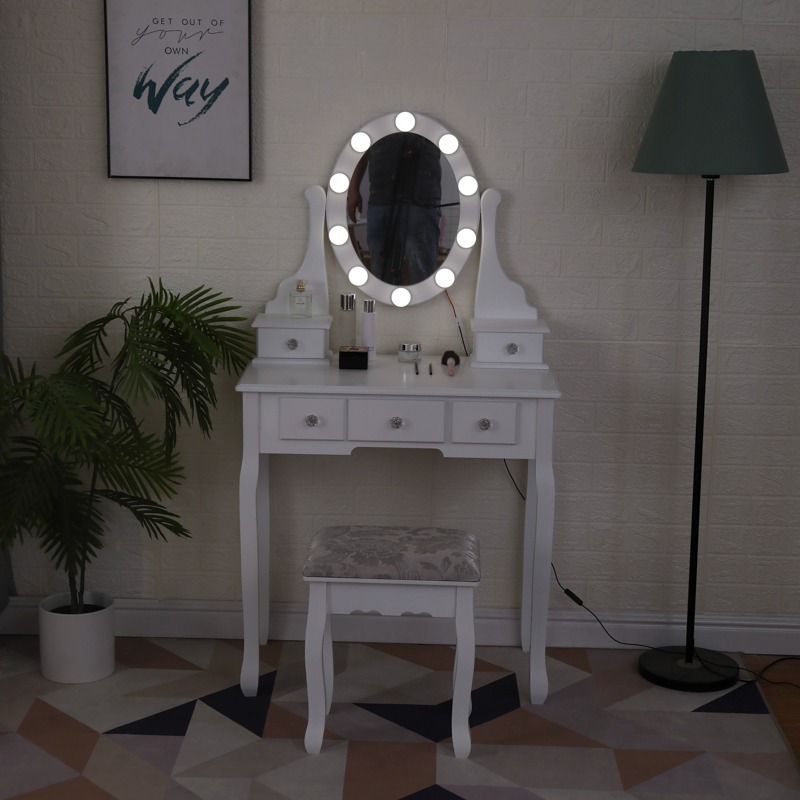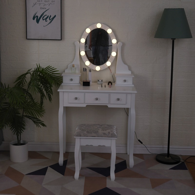 Выставочный образец, был собран, сколы и вмятины на ножках, подтеки краски на ящиках + непрокрас, состояние нормальное. Изящный туалетный столик для спальни в классическом стиле с зеркалом с ламповой подсветкой и выдвижными ящиками порадует юную леди и ее маму. Лаконичный, компактный, при этом вместительный, столик S010 обладает практичной глубиной - 40,5см. Зеркало может менять угол наклона, что очень удобно при нанесении макияжа. Столик изготовлен из массива клёна - экологичного, прочного и легкого материала, с использованием МДФ. Покрытие - краска на основе воды и воска. Роскошный пуф, на изящных ножках, входящий в комплект, декорирован инкрустацией. Ткань - полиэстер, наполнитель ППУ. Размеры столика: 141х40,5х75,5; размеры пуфа: 46х27х37см; размеры зеркала 38х48см. Размеры ящиков (внутренние): верхние ящики Г7см, Ш12,5см, В5см; боковые (нижние) Г26см, Ш10,5см, В5,5см; центральный Г26см, Ш18см, В5,5см. Лампы по периметру зеркала равномерно освещают лицо, что делает нанесение макияжа не только удобным, но и приятным. Подсветка имеет три режима регулировки яркости (пульт проводной; лампочки в комплекте). Туалетный столик от Vinotti станет отличной прикроватной тумбой, женским столиком для макияжа, или удобной консолью для гостиной, прихожей и коридора. Инструкция по сборке внутри упаковки.